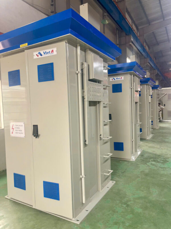 Phần thân trụ của trạm được làm bằng thép mạ kẽm nhúng nóng hoặc sơn tĩnh điện. Bên trong gồm các thiết bị đóng cắt trung thế RMU, FCO, LBFCO và hạ thế, … được nhập khẩu từ các công ty nổi tiếng như: SIEMENS, SCHNEIDER, ABB, LS …